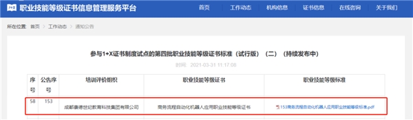 自楷柏财经研发并由其母公司康德教育集团申报的《商务流程自动化机器人应用》职业技能等级标准及其证书获批教育部第四批1+X证书制度试点以来,凭借行业领先的证书标准、注重实操应用的课程特色,受到企业雇主的广泛认可和好评,并与全国多所职业院校达成合作,共同推动RPA技能人才培养。